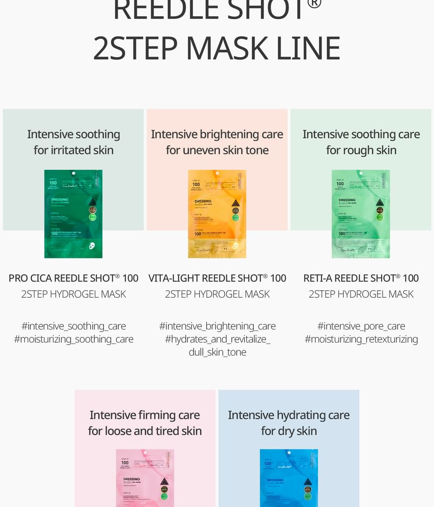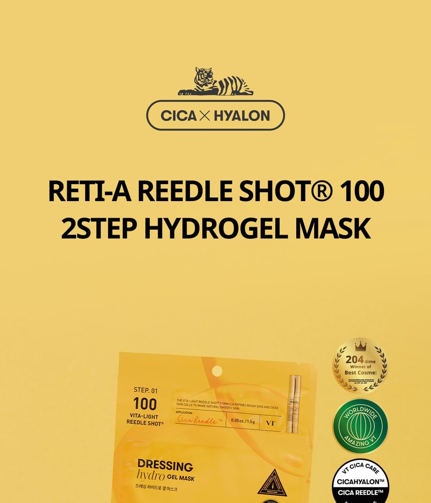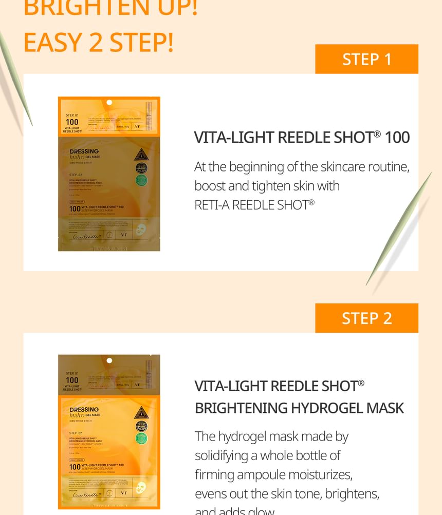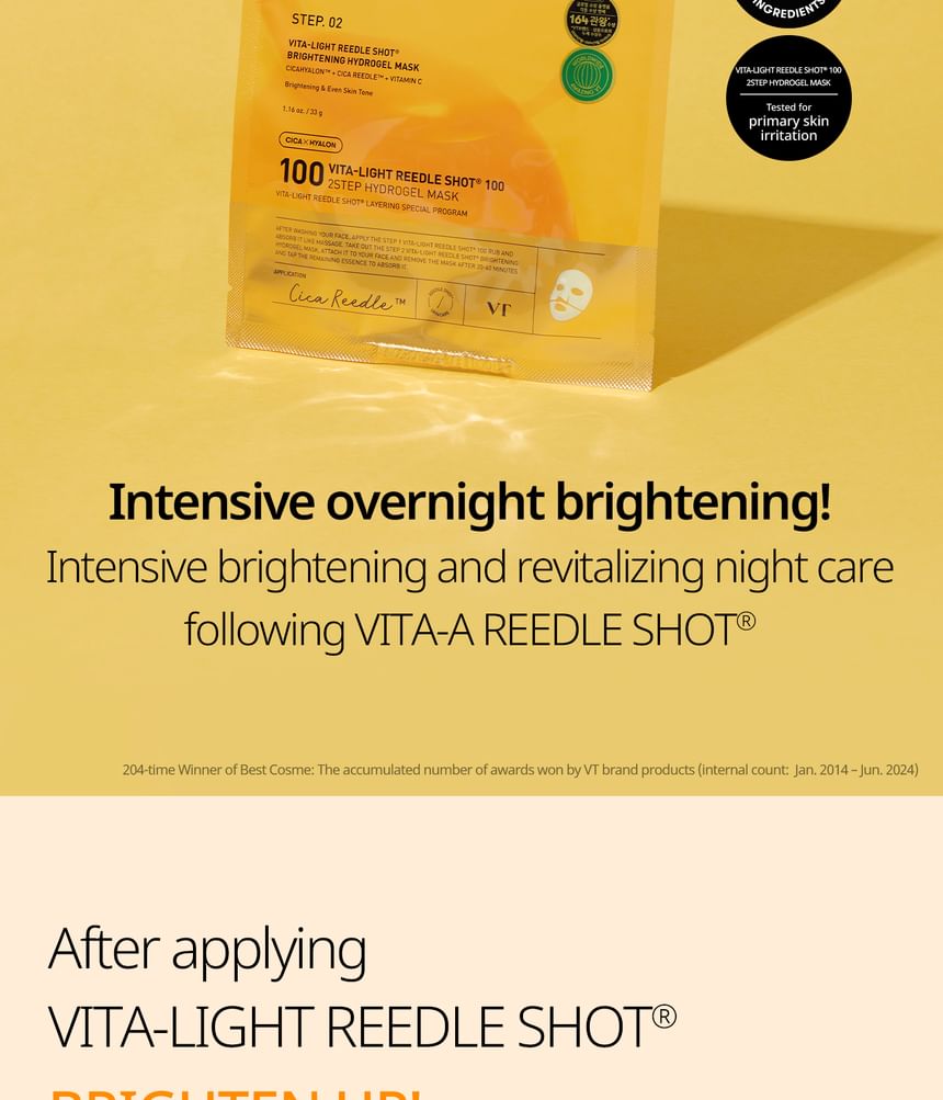 VT Vita-Light Reedle Shot 100 2-Step Hydrogel Mask is a dual-step hydrogel mask set that pairs an essence treatment with a hydrogel sheet mask. The system supports a brighter, more even-looking complexion by combining absorption-assisted delivery with hydration and soothing layers.