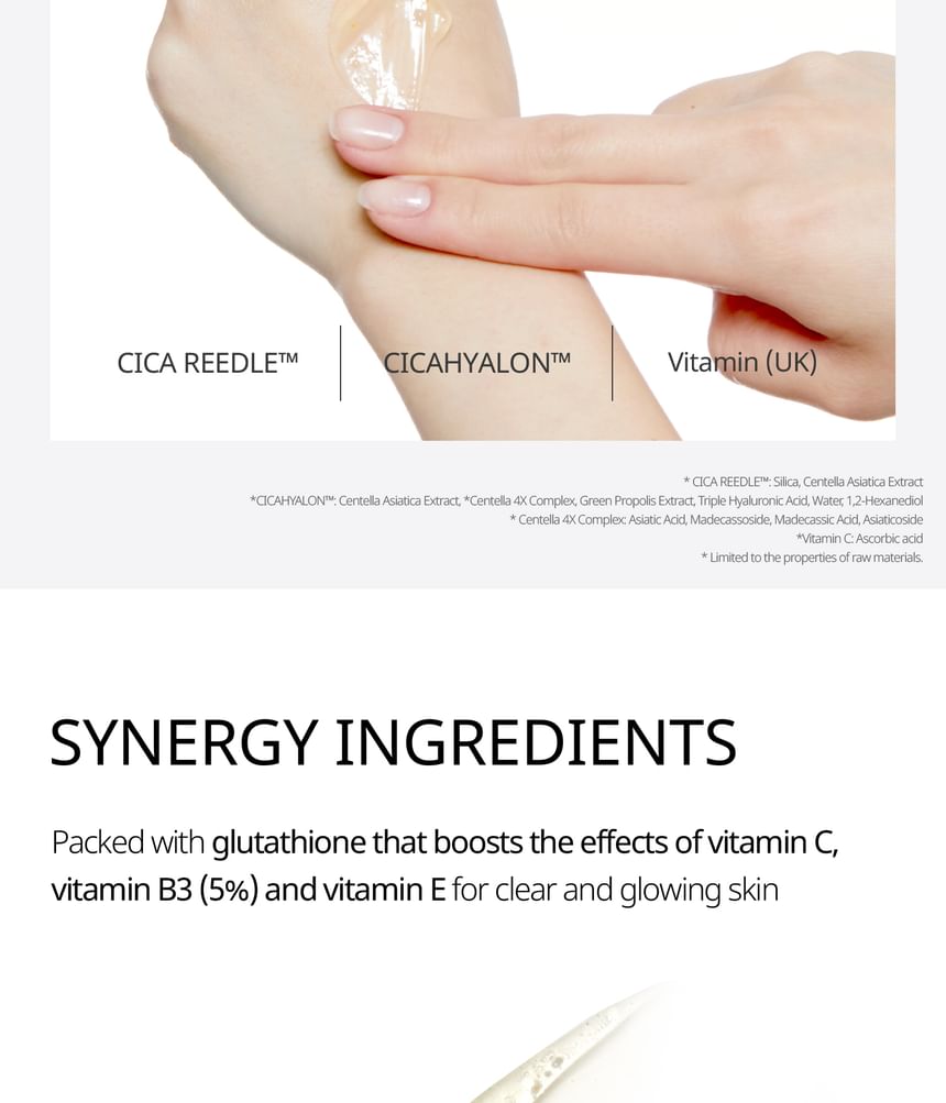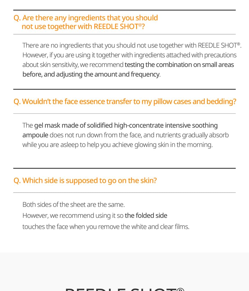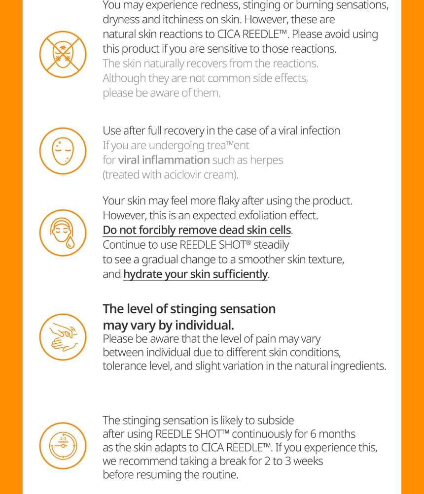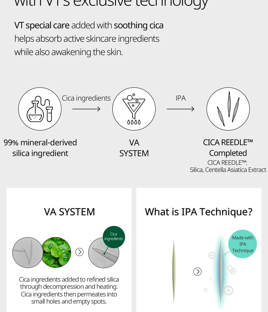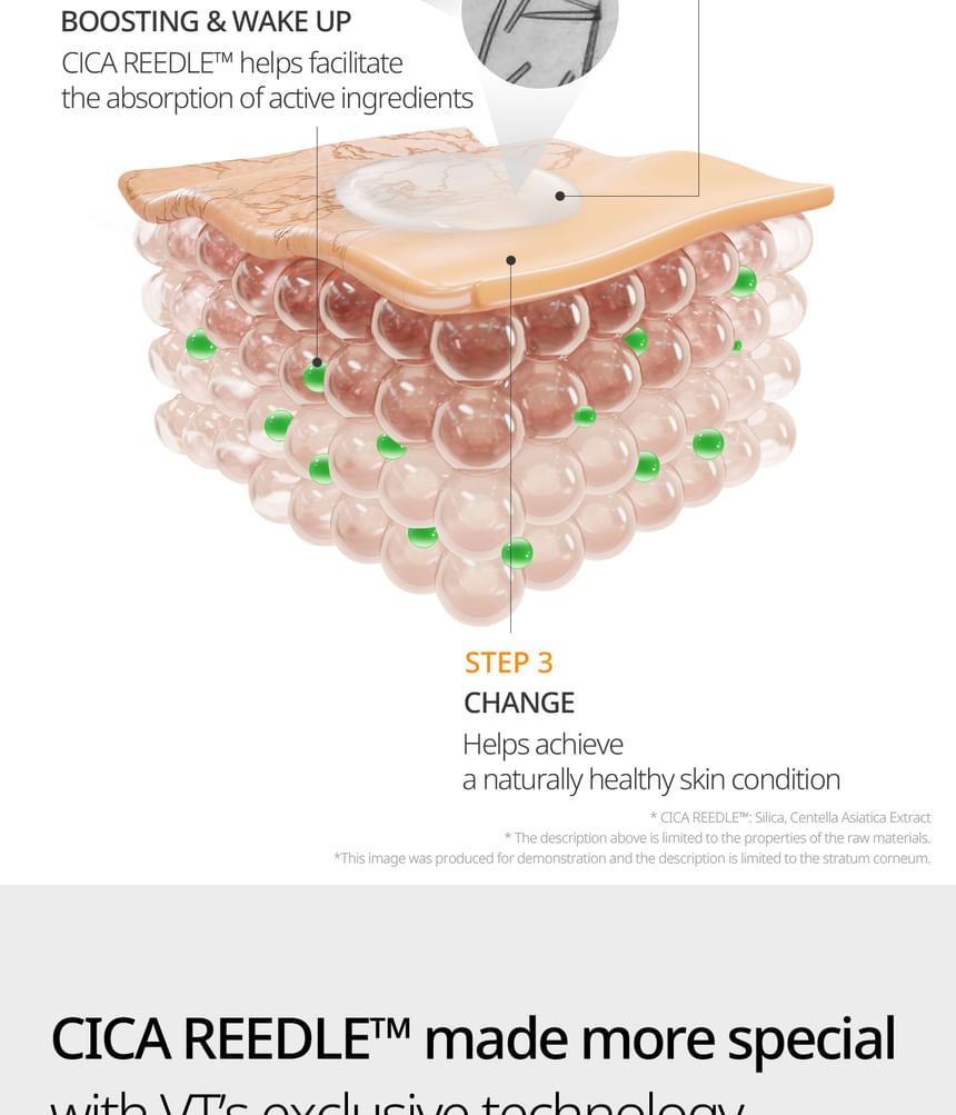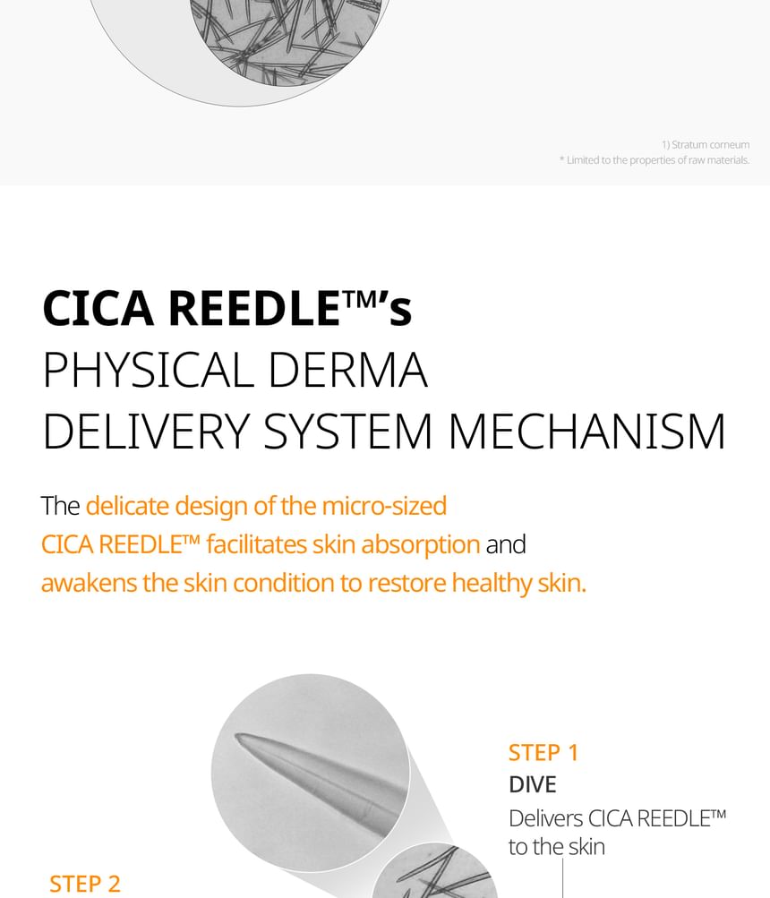 - Micro-Particle Delivery (CICA REEDLE ): Fine silica-based particles designed to assist the penetration of actives and improve the masks adherence.